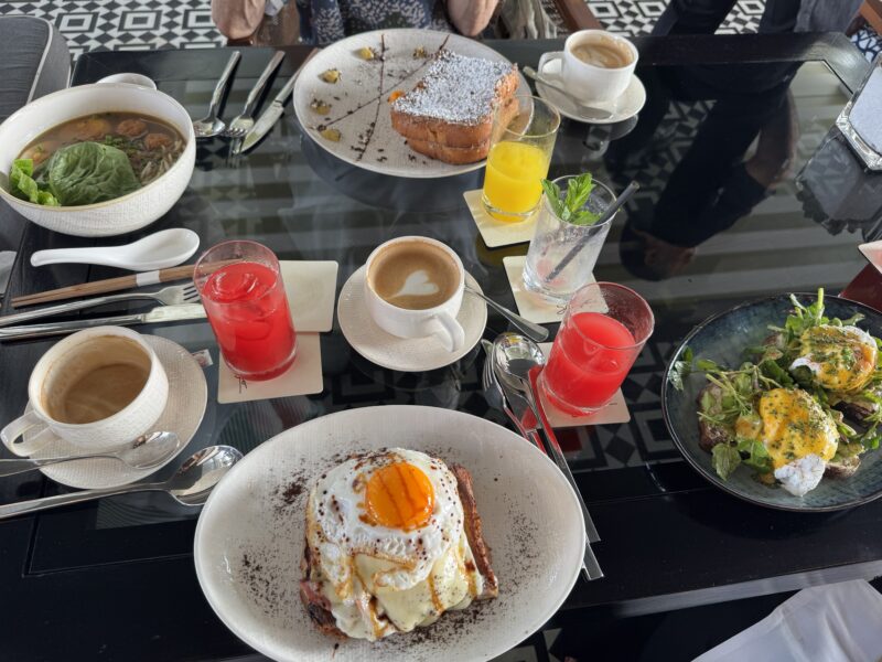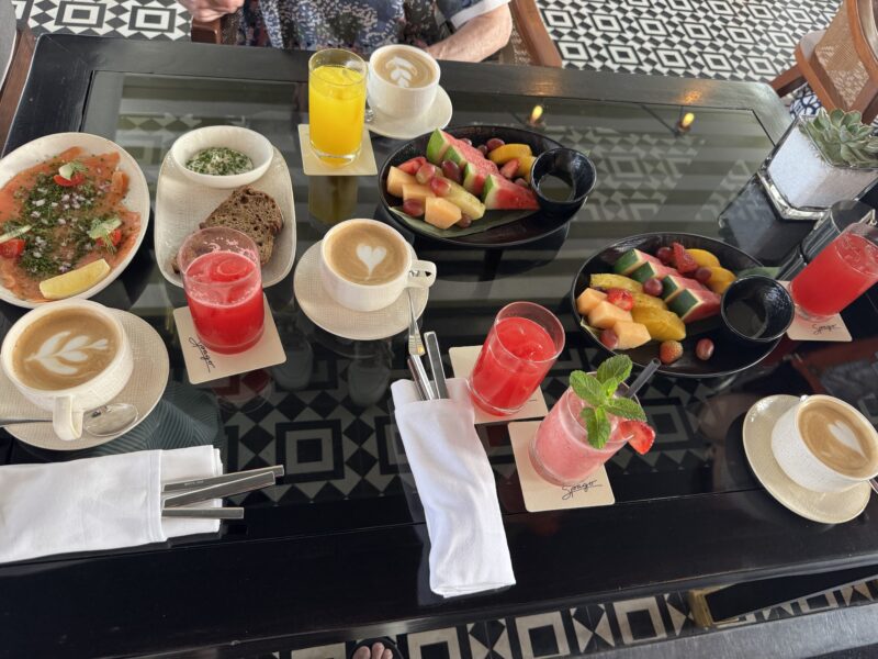 マリーナベイ・サンズの無料の朝食は、1階ロビーのRISEレストランのビュフェか、最上階にあるスパゴ・バー&ラウンジのセットメニューのどちらかを選べるので、2日目は後者にしてみました。