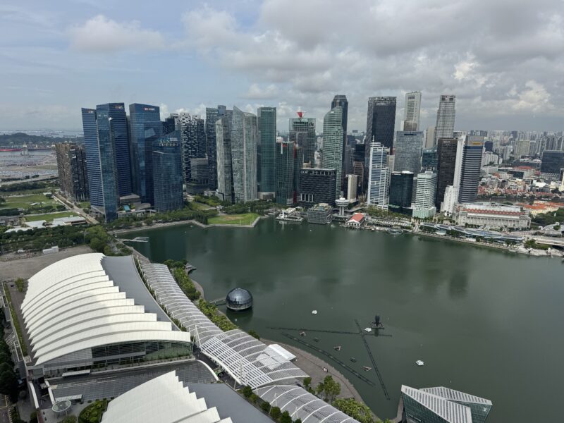 ドーム型のアップルストア、その右手に昨晩の噴水ショースペクトラの会場、それらの奥に夜景が美しかったビル群、その右側で写真の端っこに小さなマーライオンを一望できました。