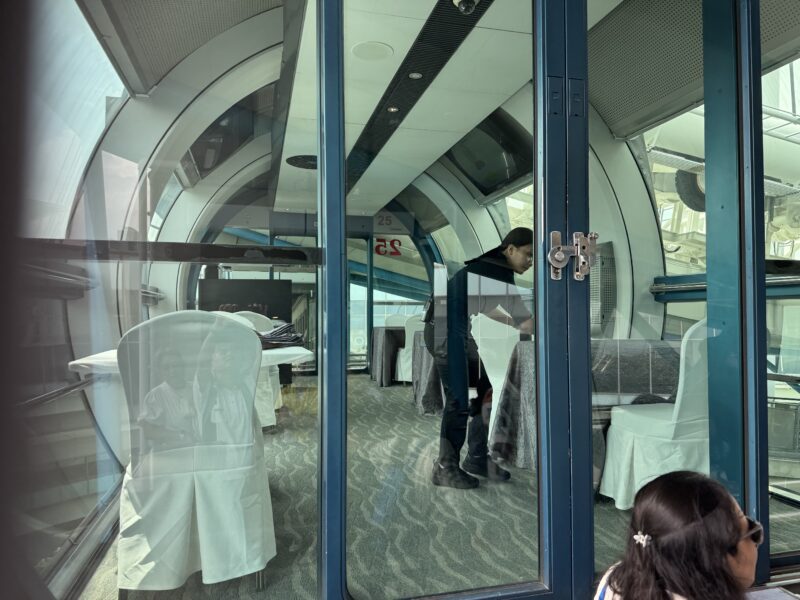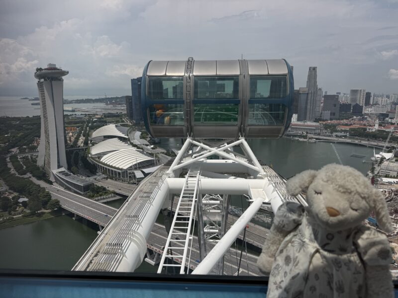 シンガポール・フライヤーのゴンドラは、一つ一つ内装が違っているのがおもしろく、写真はレストラン仕様の特別なゴンドラで、これに乗って食事をする場合は1周30分のところを3周するのですが・・・