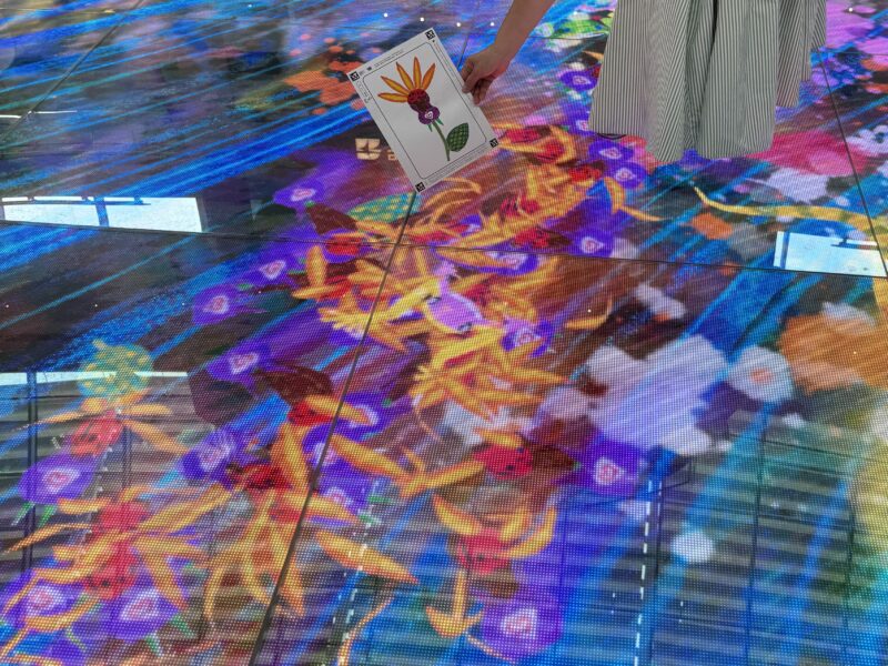 まず紙に好きな色で塗り絵をして、それをスキャンしてもらうと、床にその絵がいくつも現れて動きまわります。