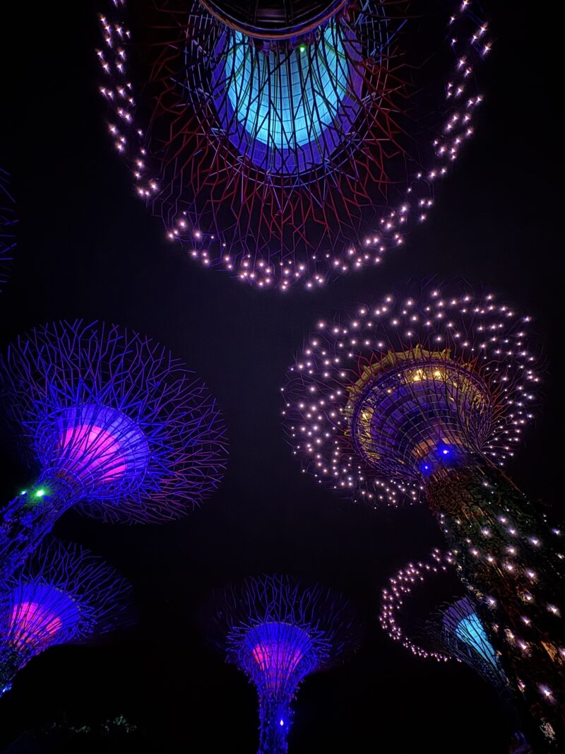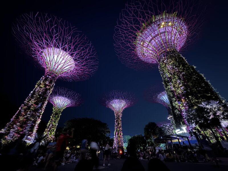 1945からの無料のガーデンラプソディのショーを見るためにガーデンズ・バイ・ザ・ベイのスーパーツリー・グローブへ行き、地面に座って待機しました。スーパーツリーのイルミネーションがきれいです。