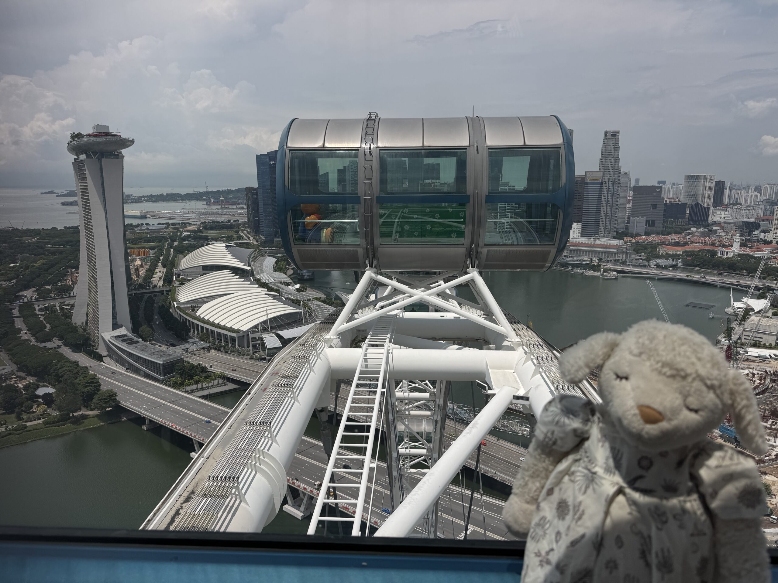 ほぼ一番高い所まで来た時に撮った写真です。左端が横から見たマリーナベイ・サンズ、その右側の白いのはショッピング・モール「ショップス・アット・マリーナベイ・サンズ」の屋根です。