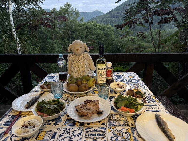 いつものコテージにチェックイン後、暗くなるのが早いので少し早めに夕食にして、BBQグリルで焼いた鮎とチキン、イカと里芋の煮物、クレソンのサラダ、栗おこわを、景色の良いベランダで美味しくいただきました。