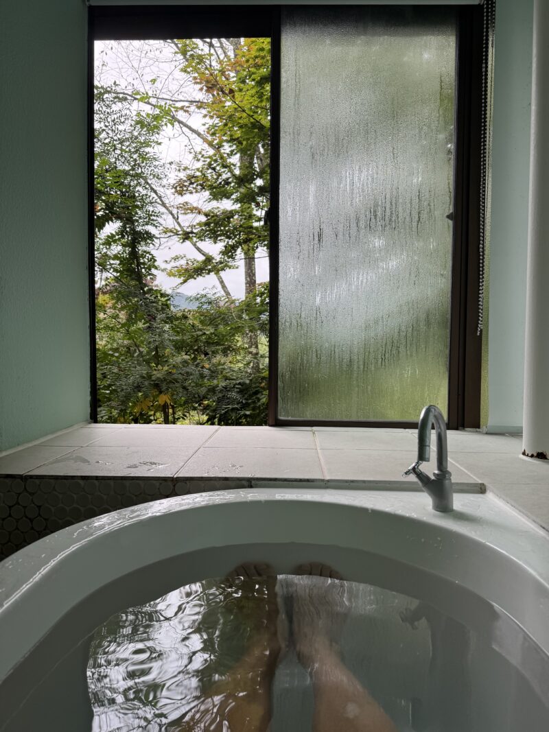 肌寒いくらい涼しいので、朝起きてまずつかるコテージの熱々の温泉が気持ちいいです。