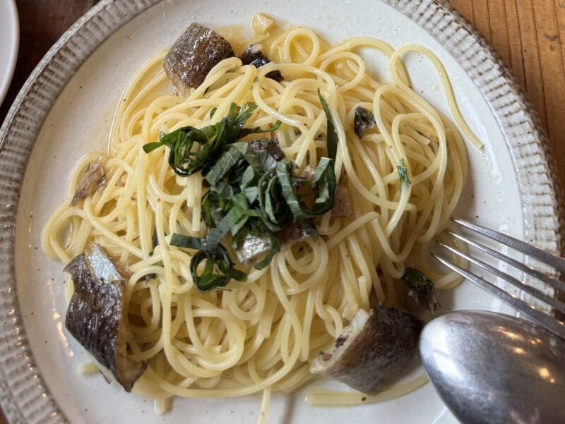 早めのランチにイタリアンカフェのトレンタトレというお店に初めて行って、私は虹鱒と大葉のペペロンチーニをいただきました。