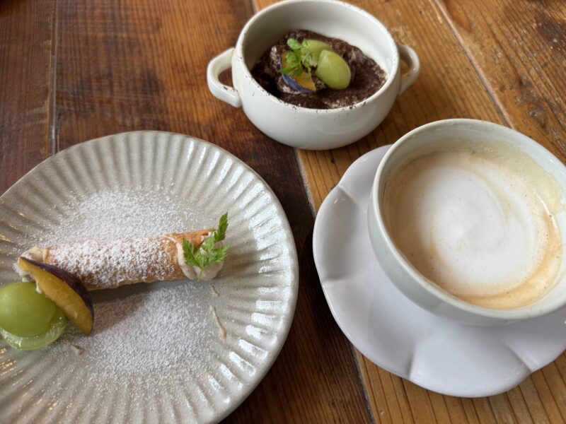 今日はデザート付きのパスタセットにしたので、私はイチジクと桃のカノーリ、妻はティラミスにして、これも美味でした。