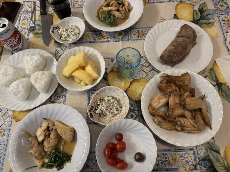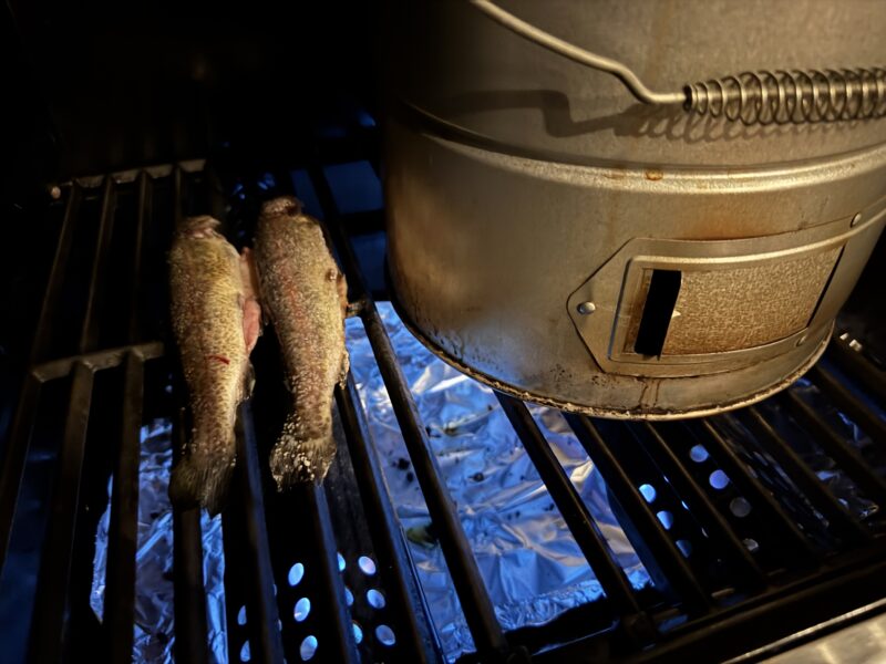 午後は、ゆで卵、サバ、チキンなどの燻製作りに勤しみ、夕食にニジマスも焼きました。