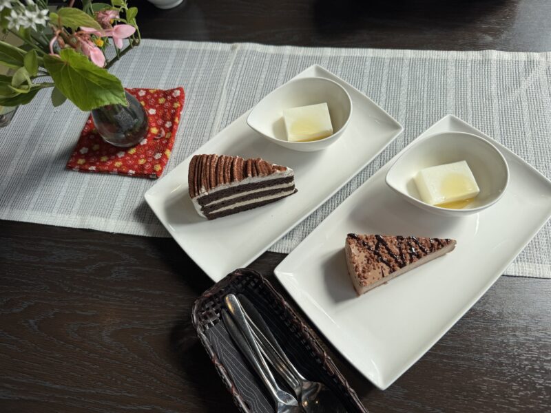 最後にデザートのババロアプリンとケーキを自家製しそジュースと一緒に美味しくいただきました。