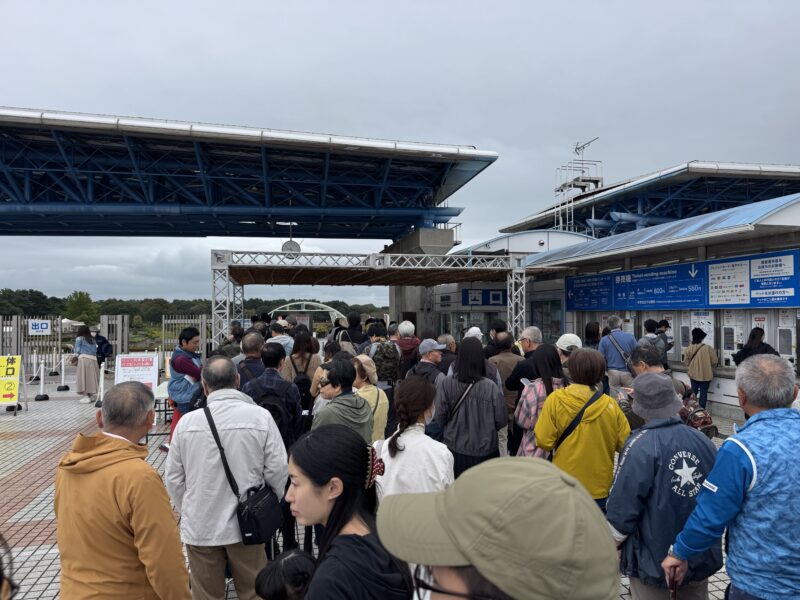 今週が紅葉したコキアの一番の見頃ということで、大混雑のおそれがありましたが、9時半開園の15分前に並んでいるのは数十名程度、平日の朝イチだと問題なしでした。
