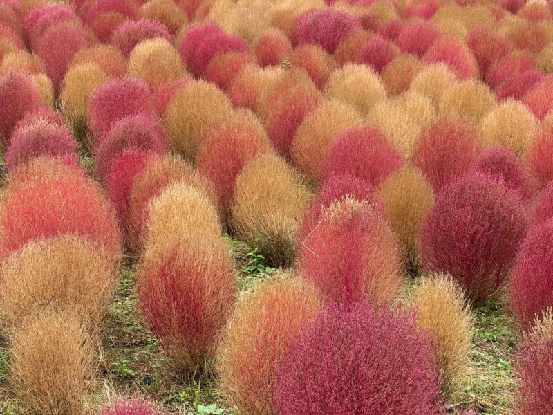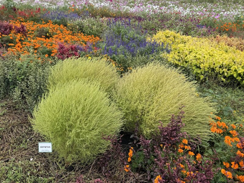 丘のふもとにコキアホワイトなる白っぽいコキアが植えられていました。コキアは赤とは限らないようですが・・・