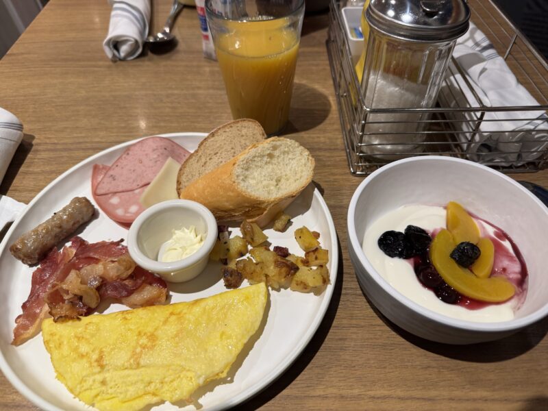 これは昨日の朝食ですが、入港風景をしっかり見たい場合や寄港地で早く下船したい場合、時間がかかるレストランの代わりにビュフェで朝食を済ませます。