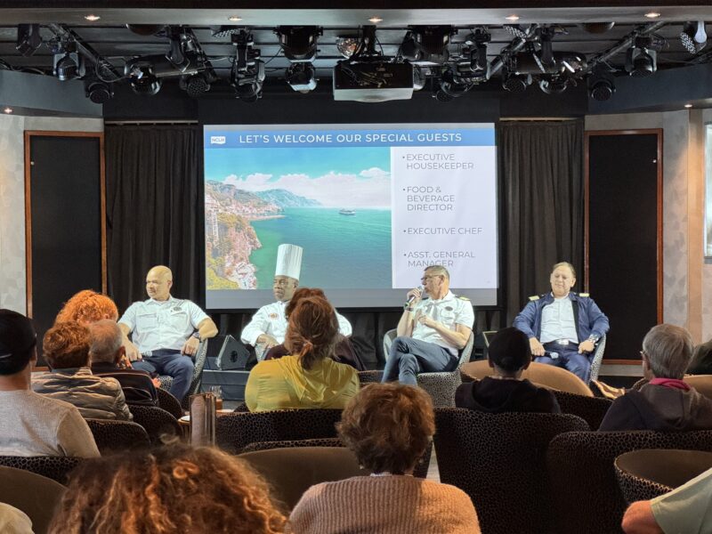 その後にこれも定番の「水上ホテル運営の秘訣Q&A」に参加しましたが、左から2人目のバルバドス人のエグゼクティブ・シェフ(料理部門の最高責任者)は、舞台裏ツアーの時にもギャレーで分かりやすく面白く説明してくれた方です。