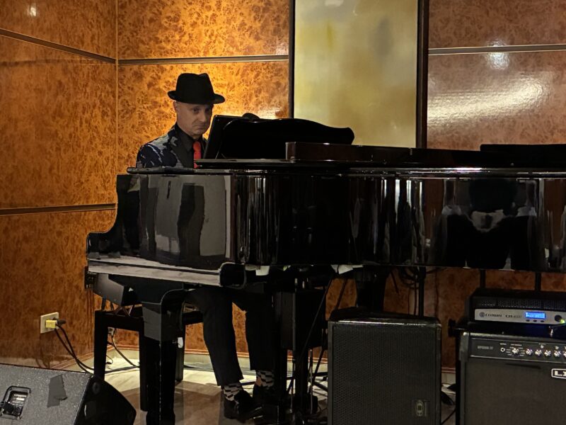 乗船後に今日の船内プログラムをチェックした時に、なんと1年前のアフリカクルーズで毎晩ファンが集まって楽しい時を過ごさせてくれたカナダ人ピアニストのエド・ケリーさんがこの船に乗っていることが分かり、再会を楽しみにしながら19時過ぎのセッションを聴きに行きました。