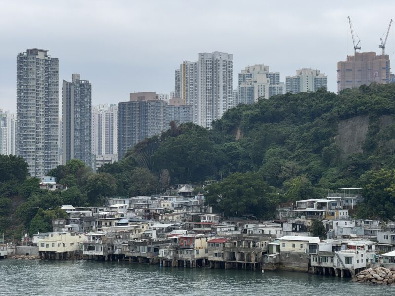本土と香港島の間の水路の最狭部を通過する際には、本土側(右舷側)の岸辺にびっしり家々が建ち並んでいて、背景の高層ビルがなければ東南アジアのイメージです。