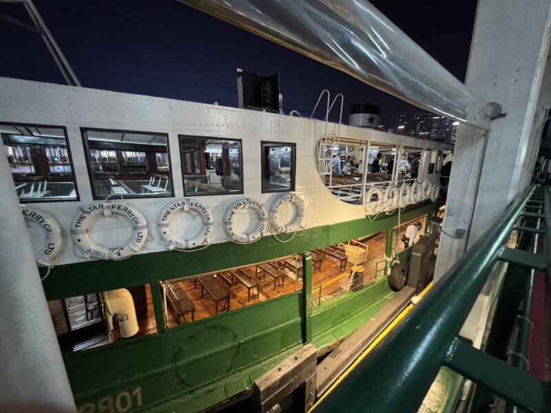 フェリーは2階建てで、2階が1等、1階が2等ですが、運賃差はたったのHK$0.1(2円)なので2階に乗るつもりだったところ、乗船時も下船時も通った桟橋は2階専用で、逆にどうやったら1階に乗れるのか分からないままでした。