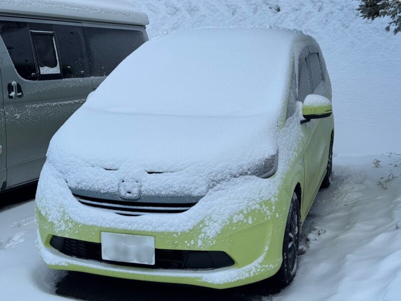 蓼科高原での最後の夜の間にまた降雪があり、チェックアウトする前に車の雪かきが必要で、宿の駐車場から出る登り坂で冬タイヤでも空回りしたので、一旦バックして少し勢いを付けて登りました。