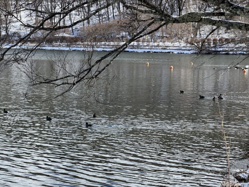 凍っていない部分の湖面には、たくさんのオオバンがいました。