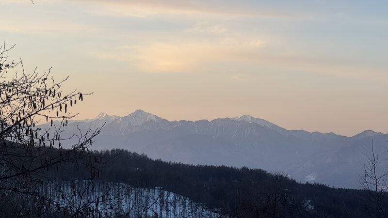 昨晩は稜線を覆っていた雲もなくなり、南アルプスのとんがった北岳(3193m)、その右隣の三角形をした甲斐駒ヶ岳(2967m)、その右に少し離れて仙丈ヶ岳(3033m)が、くっきり望めました。