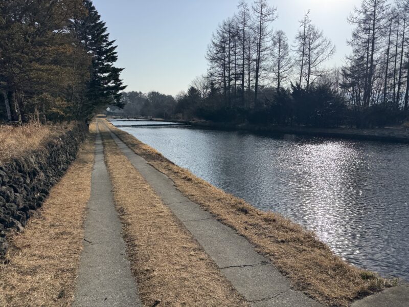 浅間山からの冷たい水を、幅広で浅いこの水路をゆっくり流す間に太陽光で温めることで、稲作に使える水温にするのだそうです。
