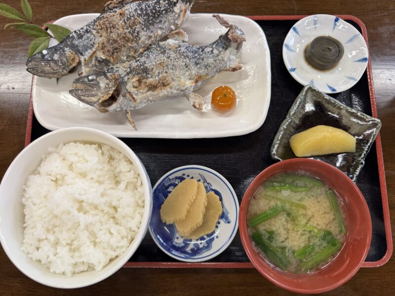 最終日はホテルをチェックアウトした後、車で10分ほどの釣り堀に併設のお店「歩歩歩(さんぽ)」で岩魚と山女魚の焼き魚定食をランチにいただいてから帰路につくことが多いです。
