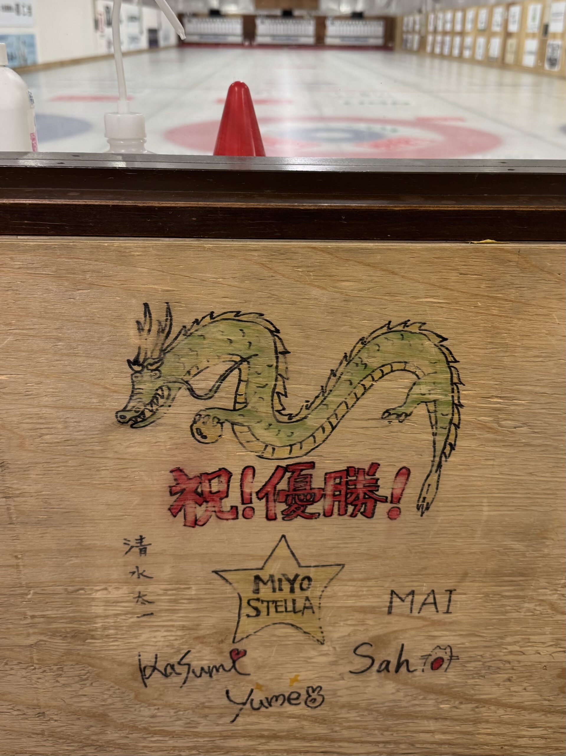 ここは本州最古のカーリング専用施設で、映画『カーリングの神様』はここで撮影されました。映画の主人公たちのカーリングチーム「MIYO STELLA」の落書きもちゃんと残っています。