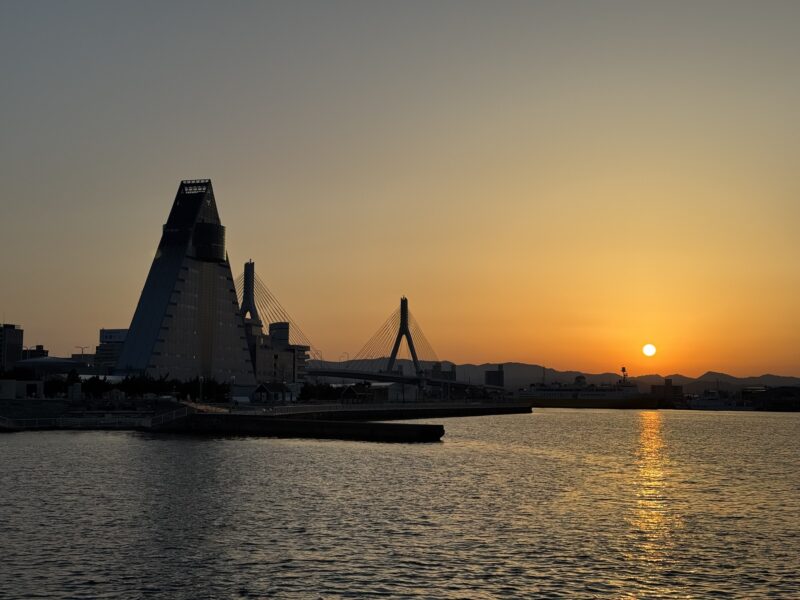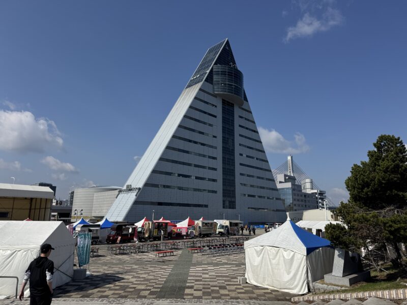 混雑した電車で立ったまま青森駅に戻り、青い海公園の海岸沿いプロムナードを歩いて船に戻る途中、青森県観光物産館アスパムに寄りました。