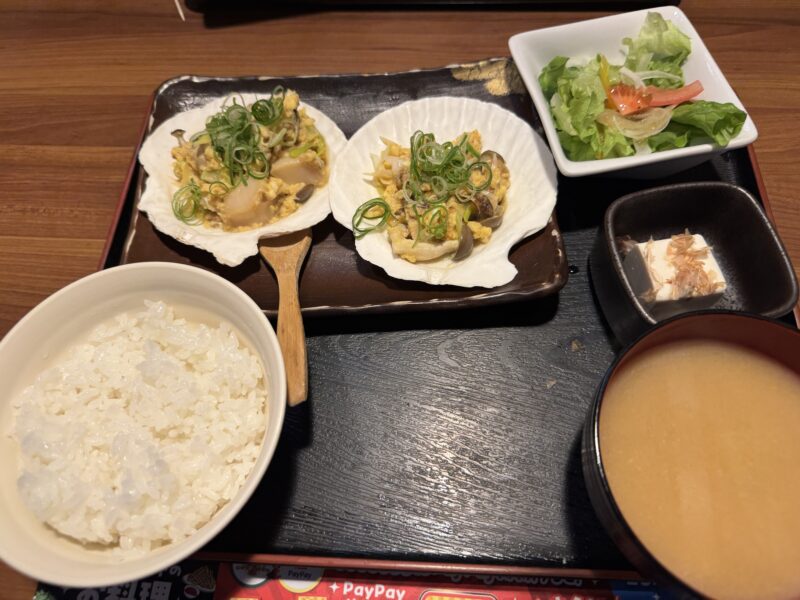 渋滞する道路をノロノロやって来たバスで弘前駅に戻り、駅前のお店で弘前の郷土料理のほたて貝焼味噌をランチにいただきました。