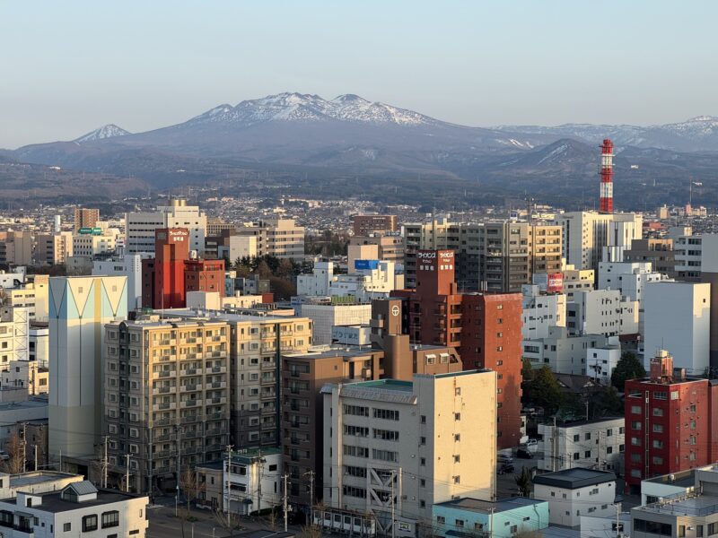 その展望台に登ると、八甲田山がよく見えました。船の寄港地ツアーには、その山腹にある酸ヶ湯温泉まで行くのもあったので、それに参加した人は山と雪の景色も楽しめたことと思います。