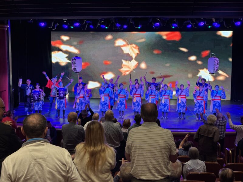 夜のショーは、盛岡の伝統的なさんさ踊り(太鼓・笛・踊りが一体となった盆踊り)の保存会の皆さんによるパフォーマンスでした。