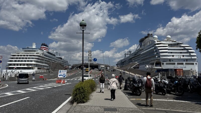 出港当日、横浜大さん橋に向かって歩いて行くと、左に飛鳥III、右に乗船するコーラル・プリンセスが接岸していました。