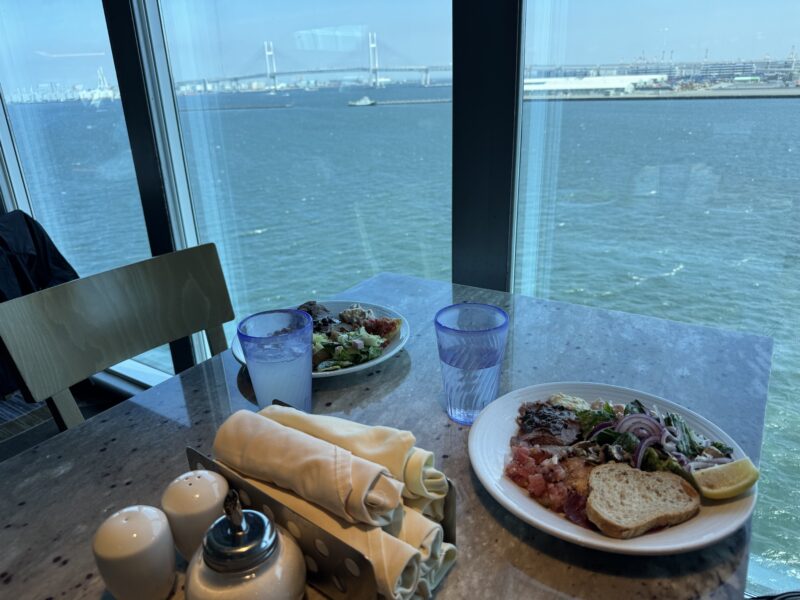 その後ろには、窓ガラスに邪魔されずに景色の写真を撮れる所がありました。大さん橋の反対側の飛鳥IIIのさらに奥の方に飛鳥IIも同時入港しているのが見えました。