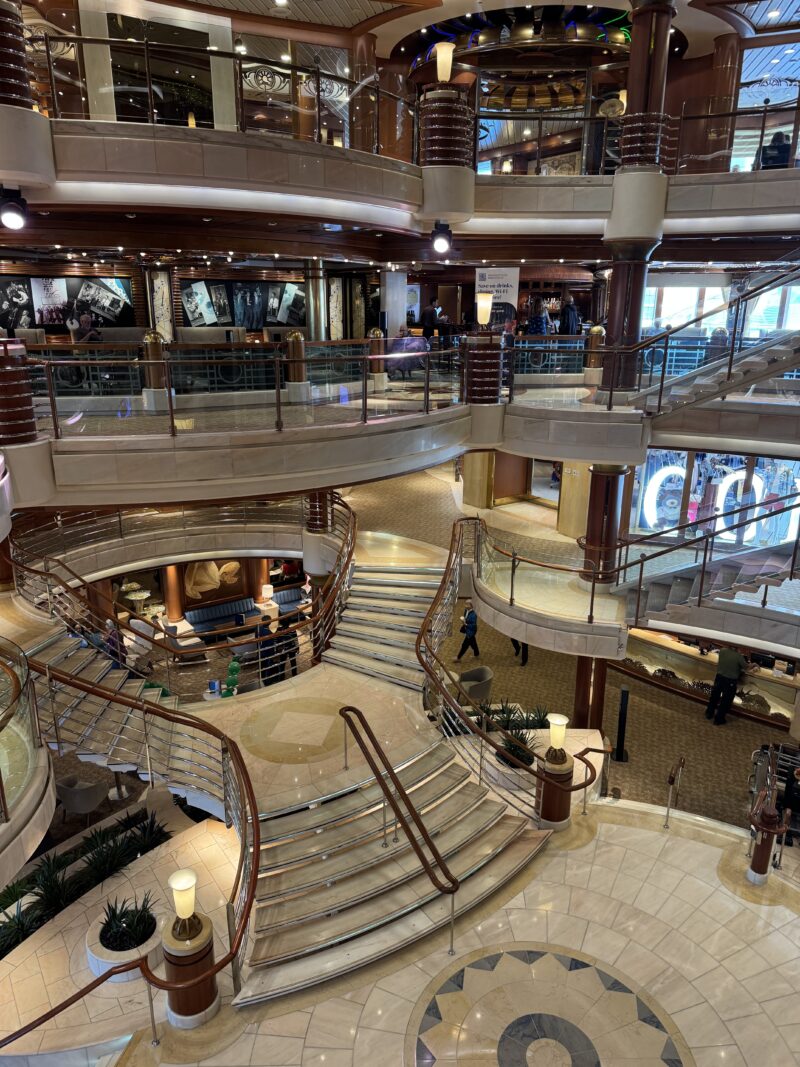 コーラル・プリンセス(9.2万トン)は、飛鳥III (5.2万トン)より大きいですが、プリンセスの中では小型(定員約2千名)です。正午からの乗船受付開始の数分前に着いて、ほとんど待つことなく乗船すると、そこは4階分吹き抜けのアトリウムでした。