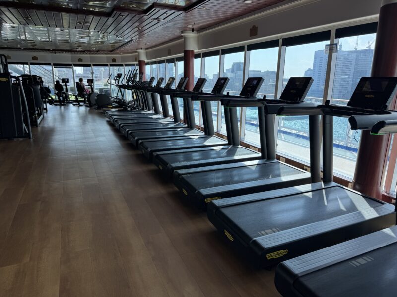 一番船尾にジムがあり、ここで景色を見ながらウォーキングマシンを使うこともあるかもしれません。