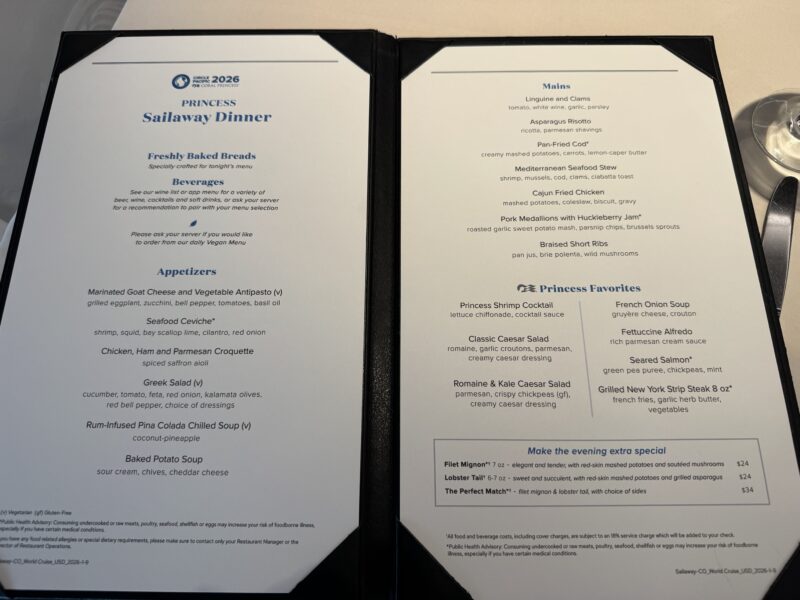 17時の開店に合わせてレストランに夕食に行くと、予約なしでもすぐにテーブルに案内されました。プリンセスでは予約が必要と聞いて面倒に思っていましたが、早めに行けば大丈夫そうです。